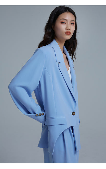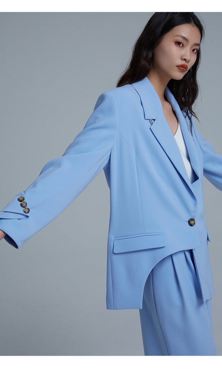 This LEDIM W high end luxury folded sleeve irregulare blue blazer is the perfect choice for the fashionable, stylish individual who desires elegance and sophistication. Crafted with a unique design and luxurious materials, this blazer is ideal for any formal outing, from weddings, to church, to work. Its dashing, classy, and glamorous look makes it an unforgettable outfit.