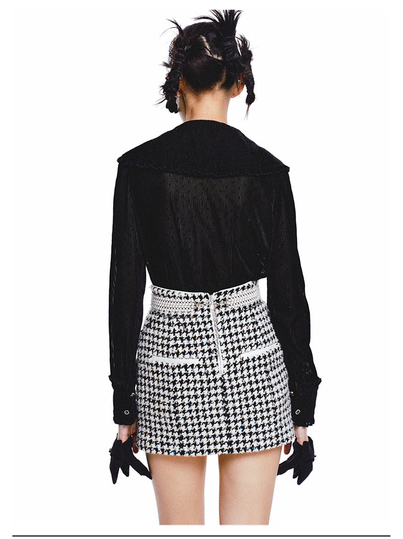 This Limited Edition Autumn Vintage Silhouette Tweed Houndstooth mini Short Skirt is tailor-made for those seeking sophistication and high-end elegance. With its classic houndstooth pattern and “old money” aesthetics, this skirt suit presents a timeless, yet sexy statement for those who demand the best. A designer, limited edition piece, perfect for a unique and stylish look.