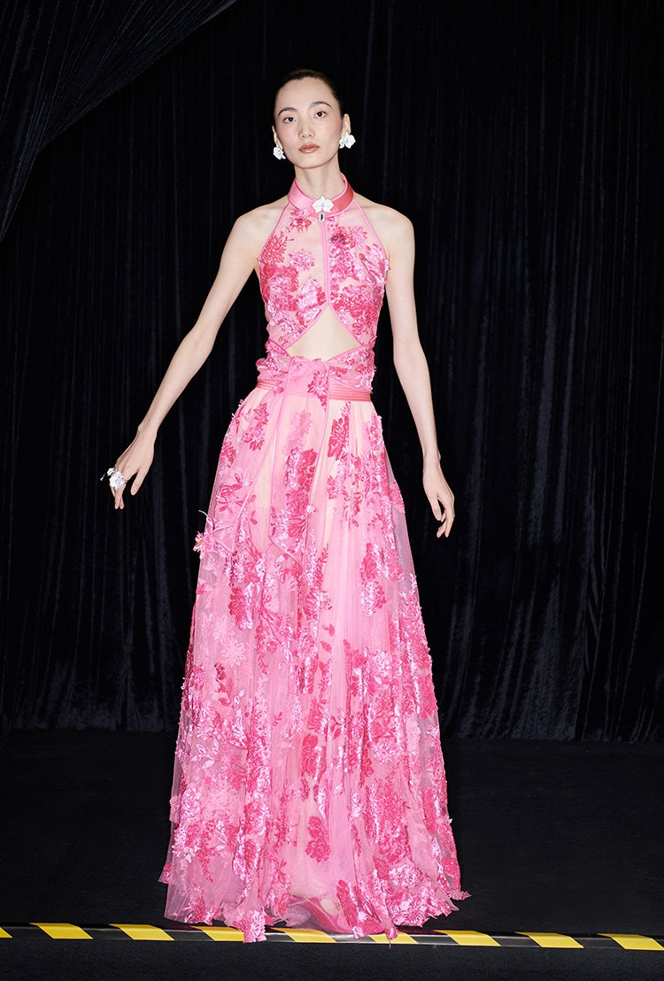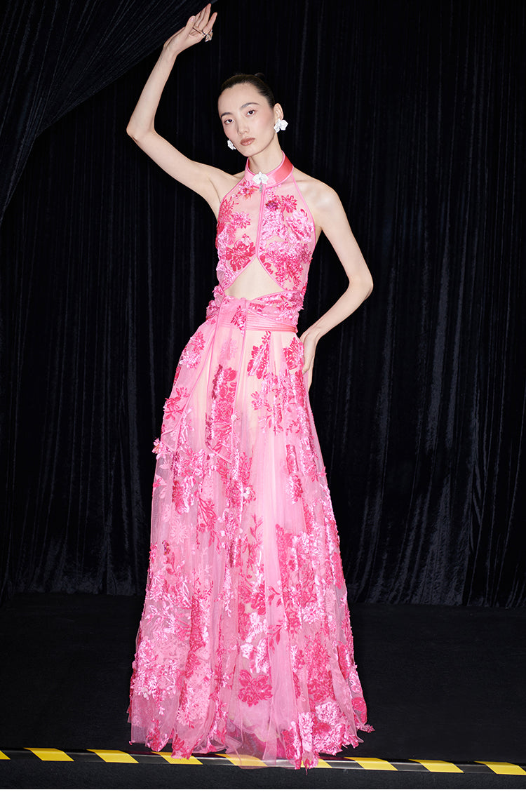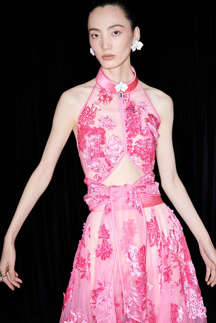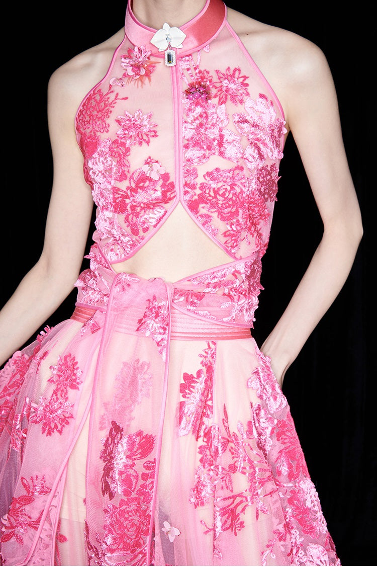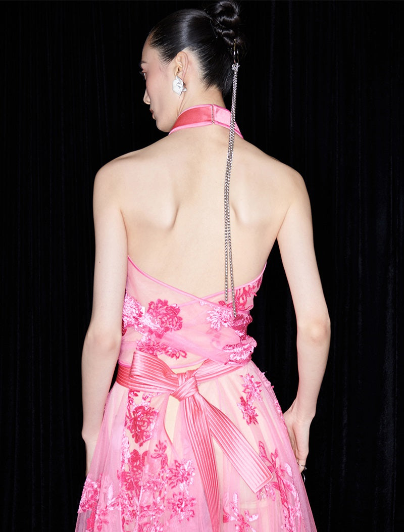 This exquisite halter-neck top showcases delicate falling flower embroidery and intricate nail bead detailing, creating a refined, feminine aesthetic. The deep V-shaped cutout extends to reveal the midriff, complemented by additional cutouts below the bust for a bold yet elegant look. A wide, solid pink satin ribbon band adds structure and contrast, enhancing the embroidered floral patterns. Perfect for making a sophisticated statement, this top blends artistry with modern design.
