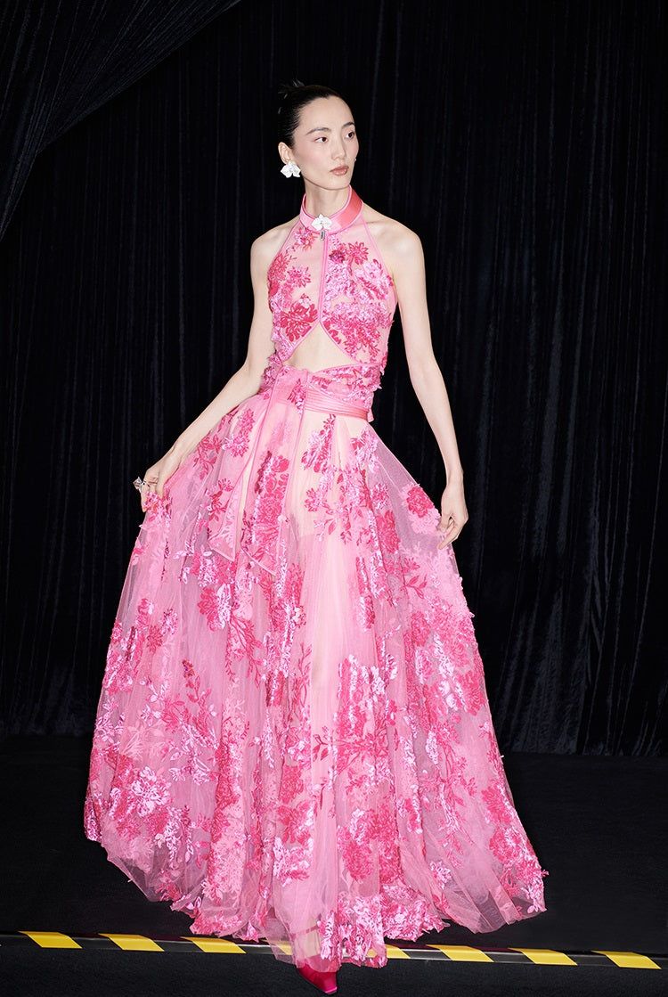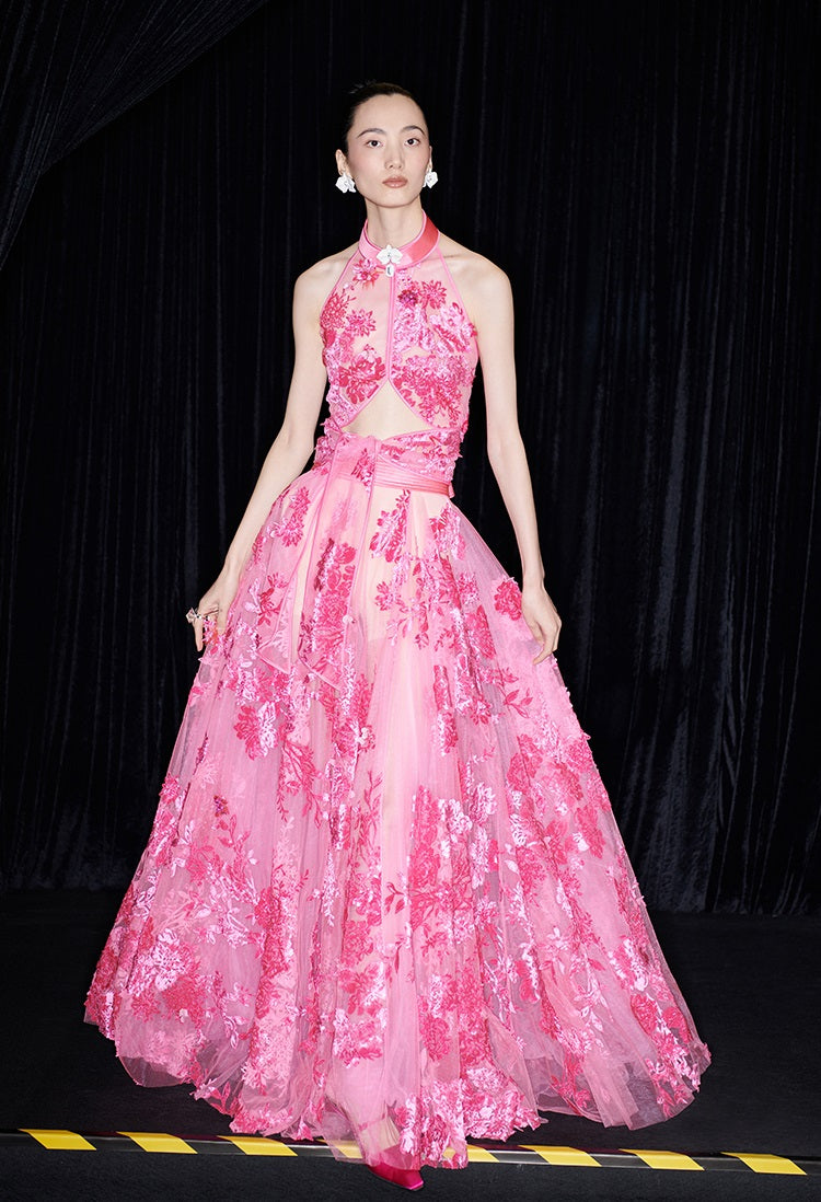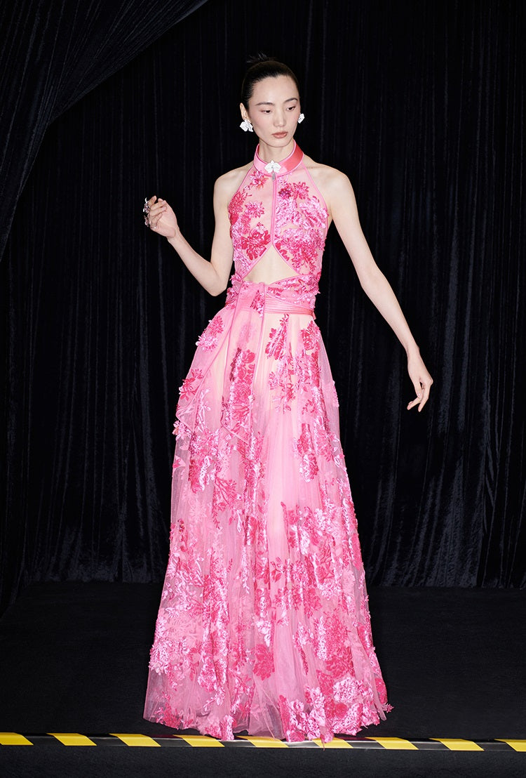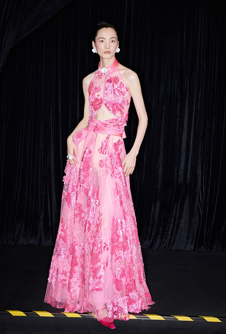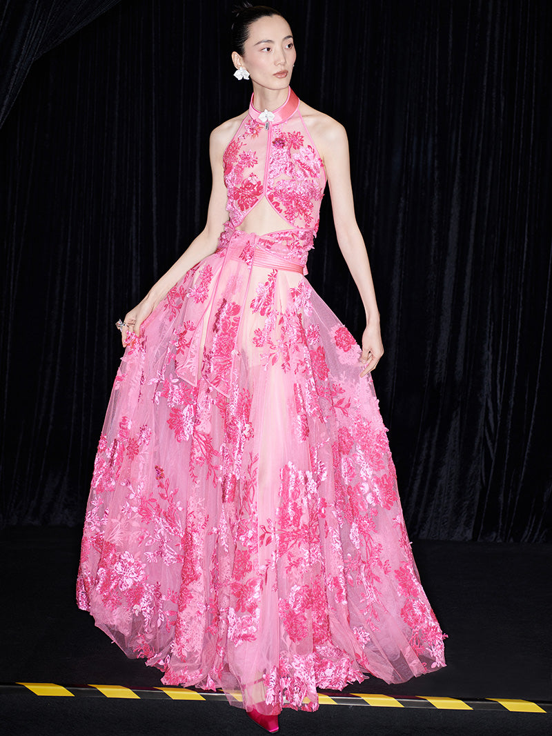 This exquisite halter-neck top showcases delicate falling flower embroidery and intricate nail bead detailing, creating a refined, feminine aesthetic. The deep V-shaped cutout extends to reveal the midriff, complemented by additional cutouts below the bust for a bold yet elegant look. A wide, solid pink satin ribbon band adds structure and contrast, enhancing the embroidered floral patterns. Perfect for making a sophisticated statement, this top blends artistry with modern design.