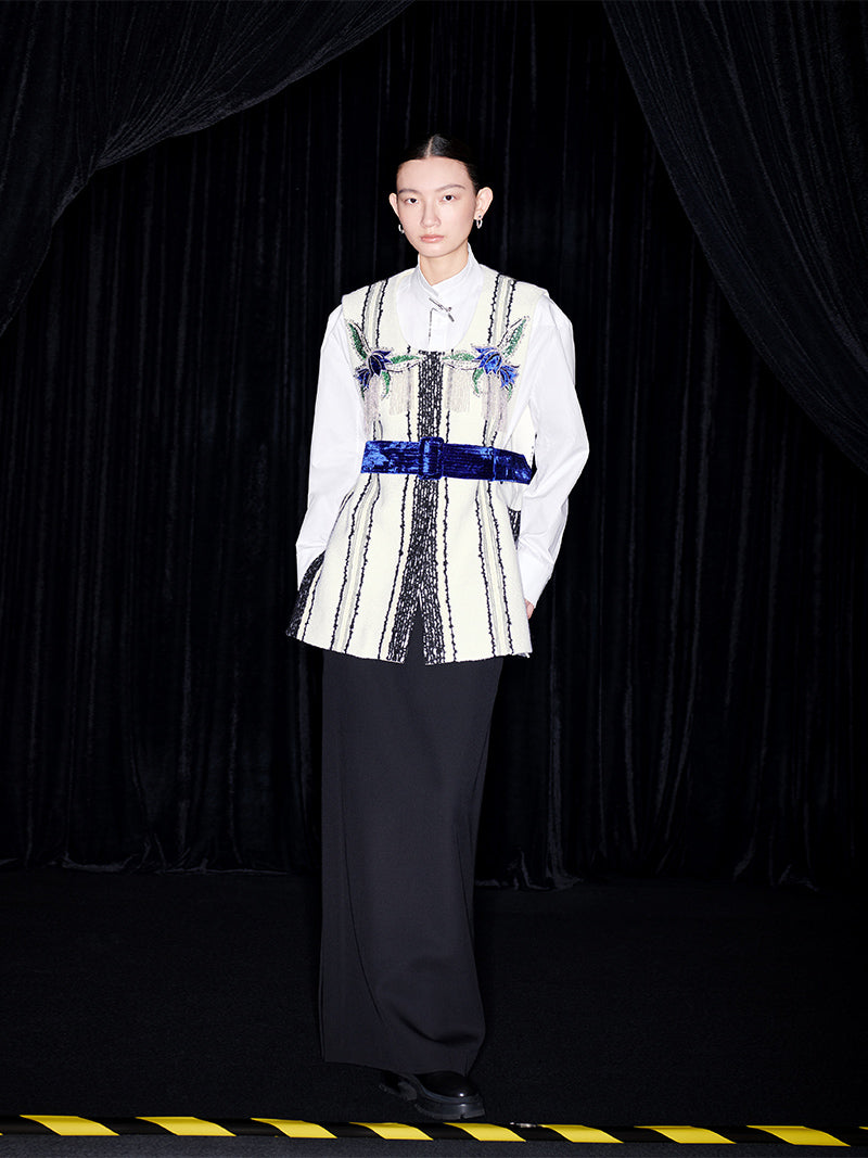 Expertly crafted for FALL occasions, elevate your wardrobe with our stylish M essential Mackay designer gilet. This versatile vest, featuring a vibrant blue belt, pairs perfectly with a white long sleeve shirt and long black skirt. The fashionable and trendy embroidery adds a touch of elegance to any outfit for a chic and classy look.