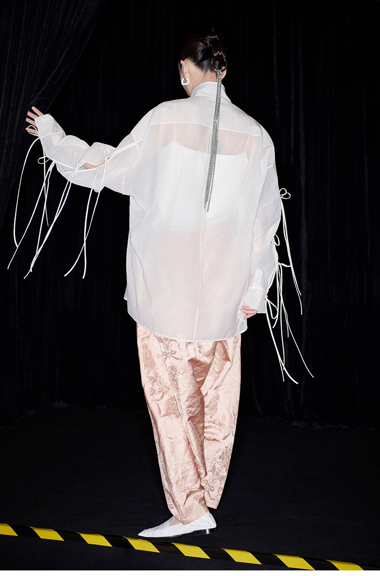 Introducing the M essential Mackay designer soft-paper pale overshirt! Take on any event with confidence and style. This see-through shirt features a fashionable collar, white vest, and pink pants to create a chic and classy look. Stay fashion-forward and trendy all summer long with this versatile and vibrant piece that offers endless matching options. Get ready to make a serious statement with this gorgeous overshirt.