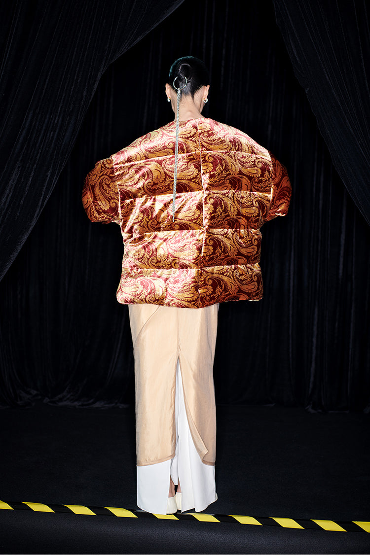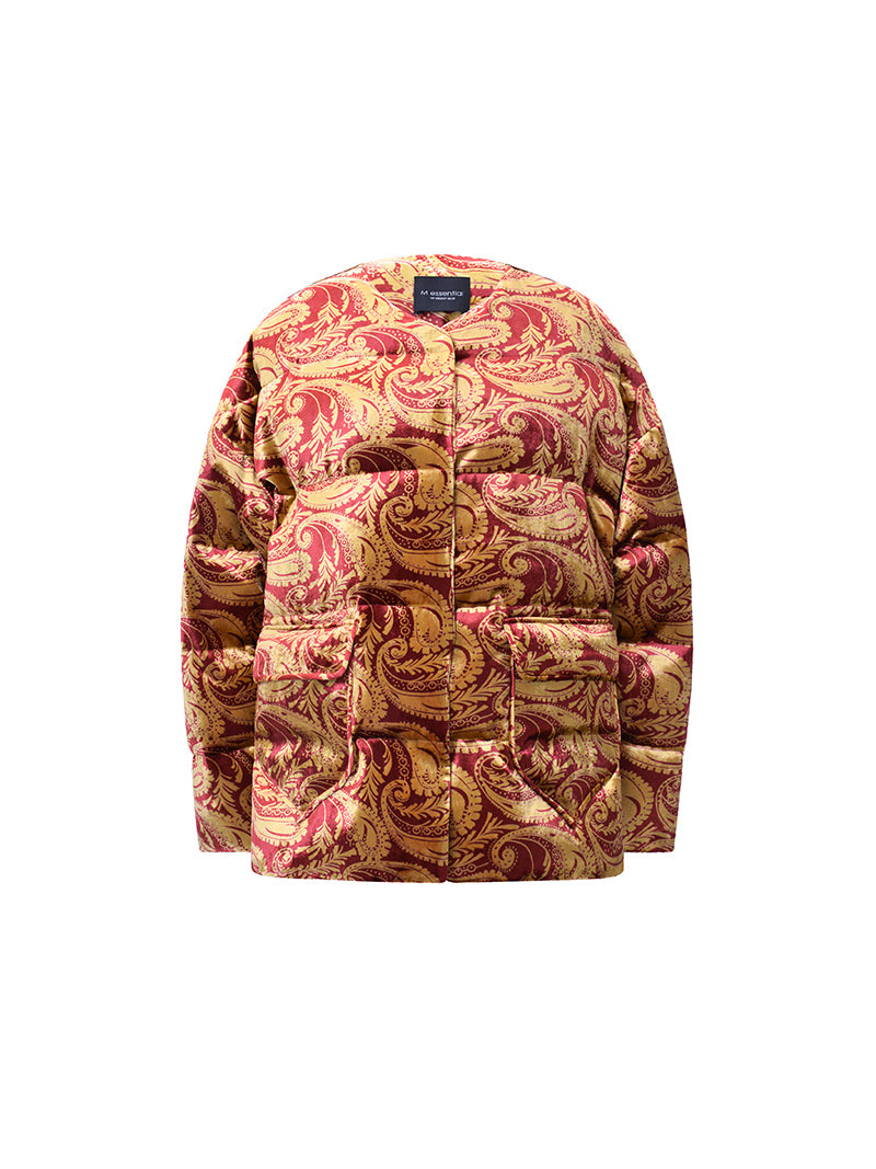 Introducing the M Essential Mackay designer Tuoba silk-velvet puffer jacket - perfect for fall events. This chic and stylish jacket features a versatile slip white dress and a pink dress that can be worn as an outer dress, making it a must-have in your wardrobe. Stay warm and fashionable with this unique, designer silhouette.