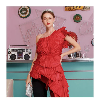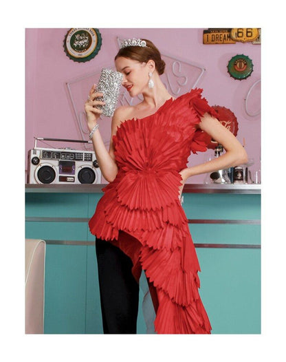 One of a kind statement quality limited edition one shoulder folding pleated flower slant shoulder evening dress banquet party bride Sexy Elegant cocktail red blouse dress - India