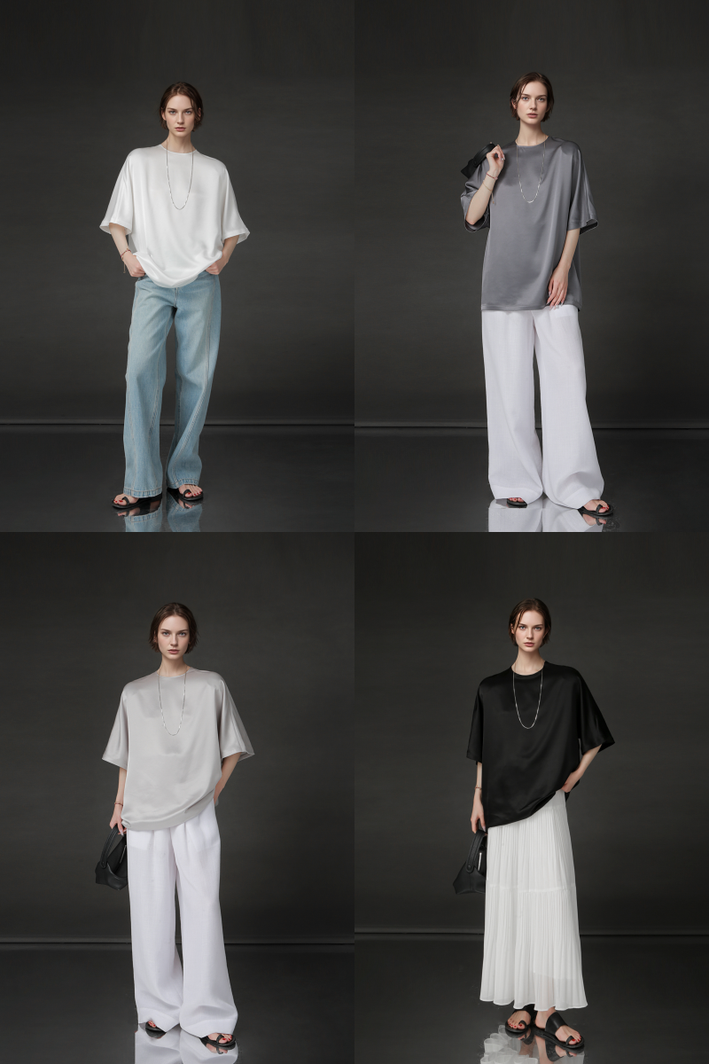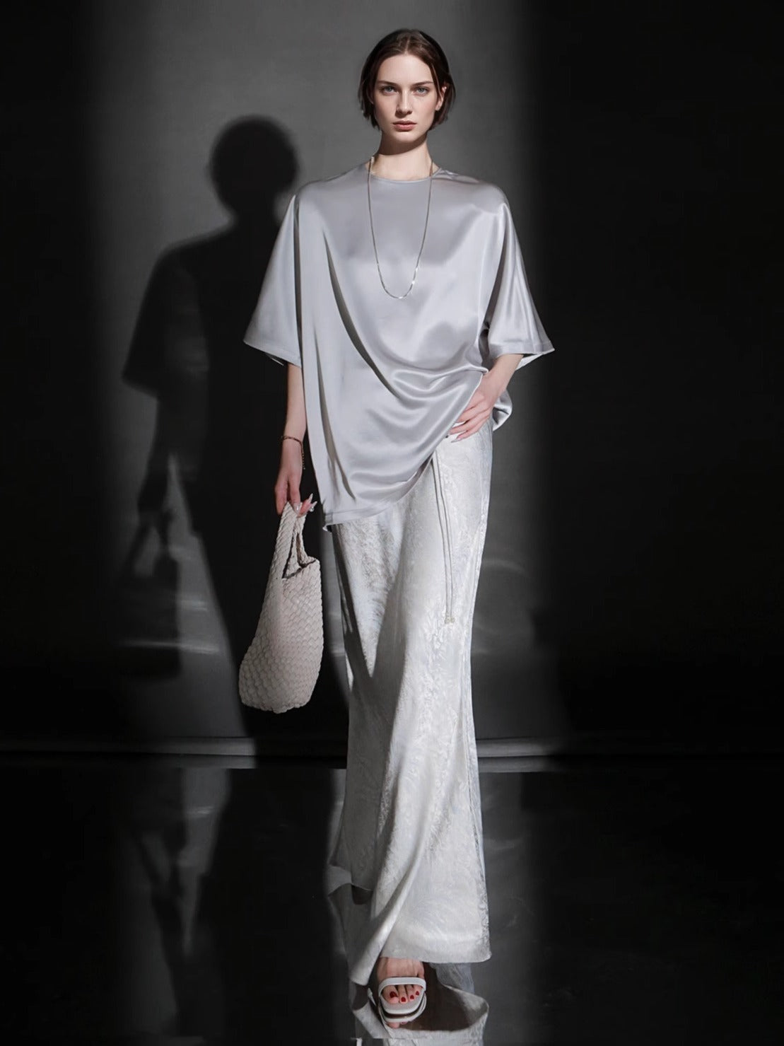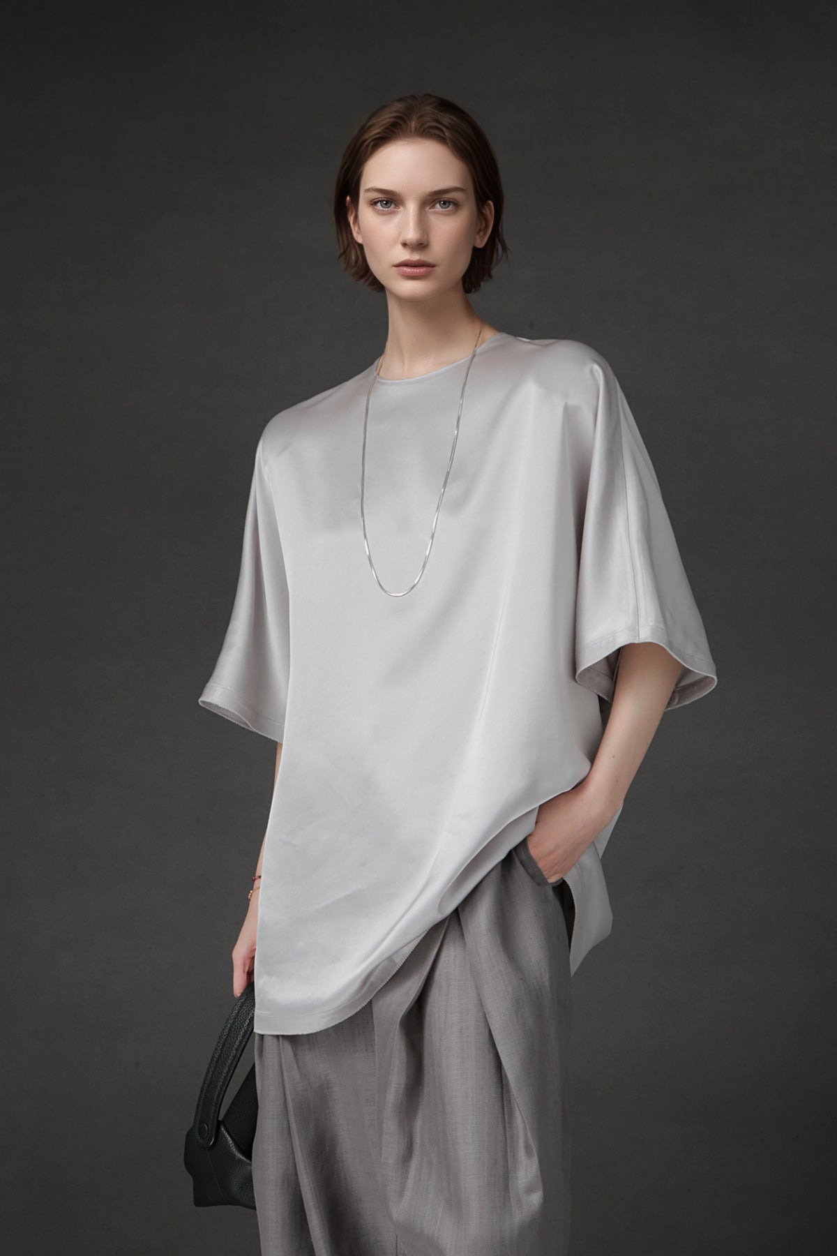 Indulge in the classy and luxurious PIAOIN light luxury T-shirt. Its acetate satin glossy fabric creates a sense of quality, perfect for the summer season. With a loose fit and mid-length sleeves, this shirt offers both style and comfort. Upgrade your wardrobe with CHARLOTTE.