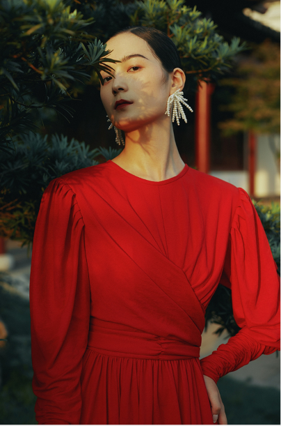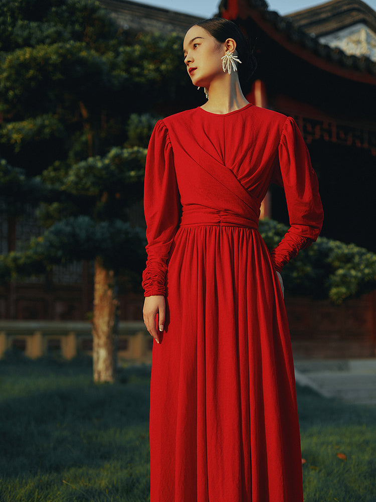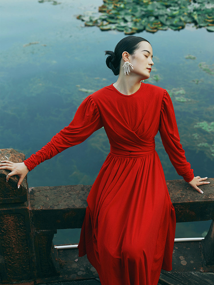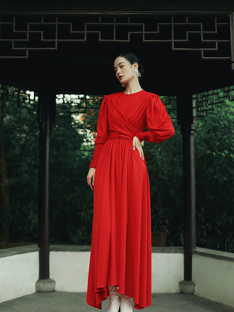 This stylish red pleated long-sleeved dress features an irregular skirt, round neck and puff sleeves, perfect for creating an eye-catching retro look. The knitted fabric provides an exceptionally flattering fit and a comfortable feel.