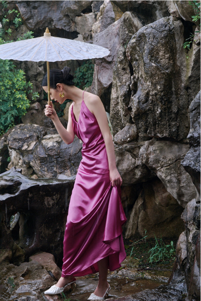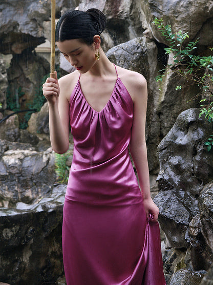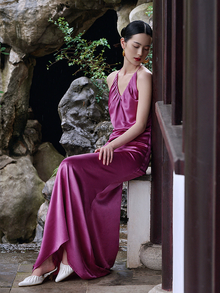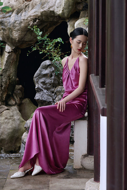 Crafted with an elegant style, this satin fitted sleeveless gown features a high waist and trailing dress skirt, available in lotus pink and retro gold hues.