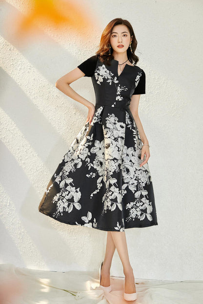 Spring retro 1950 lbd black jacquard short sleeve wedding guest Audrey Hepburn dress - Bailey