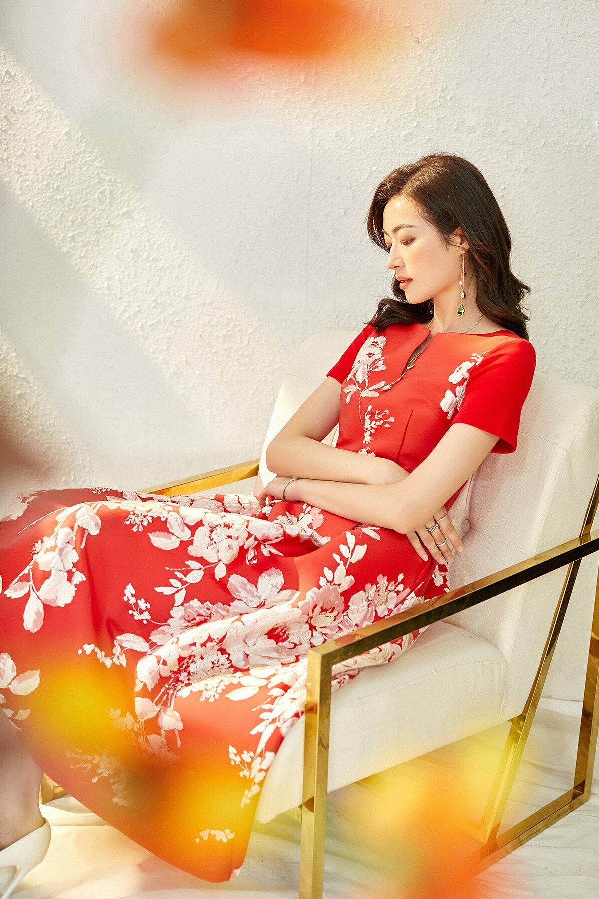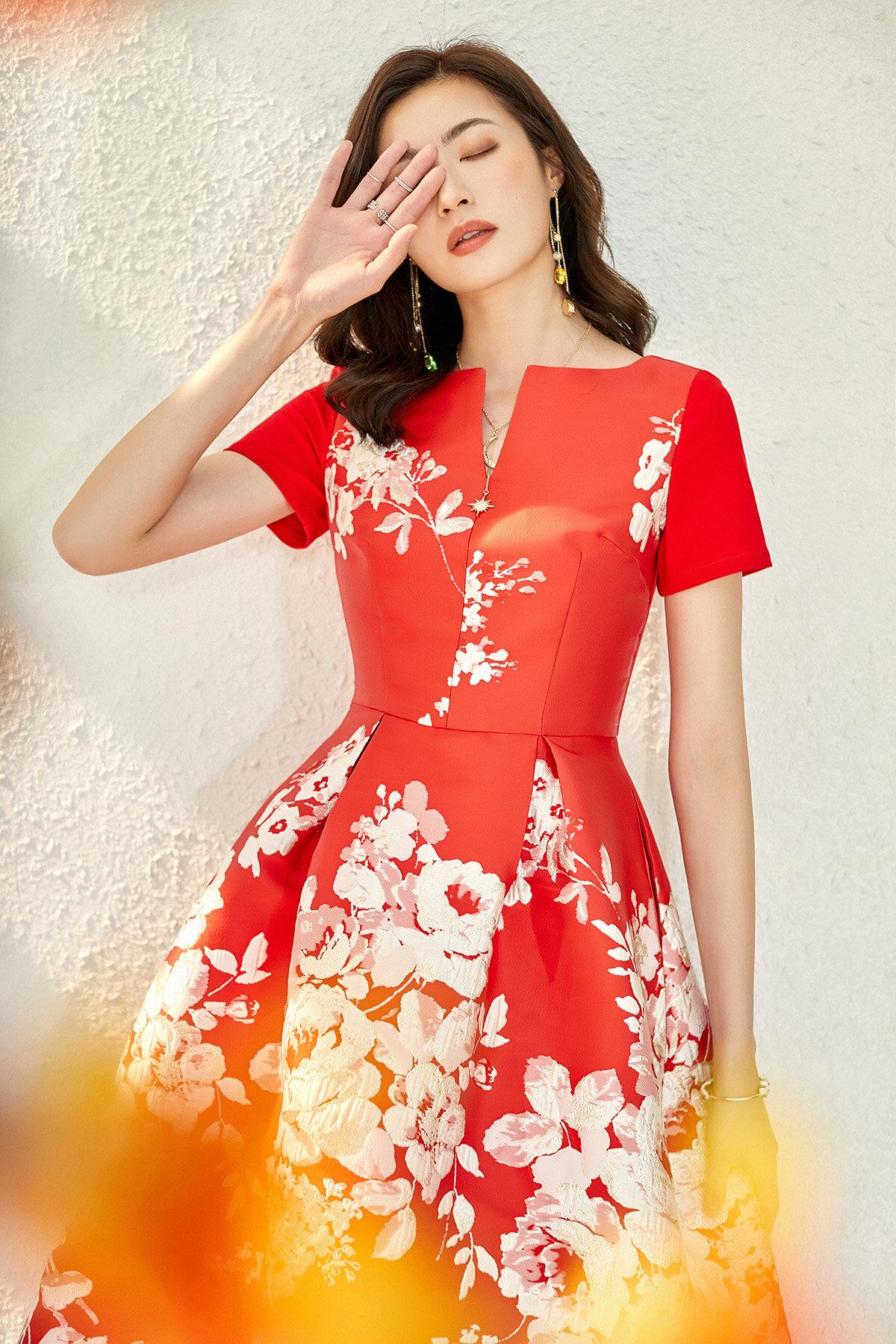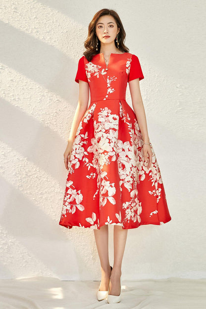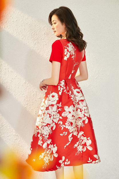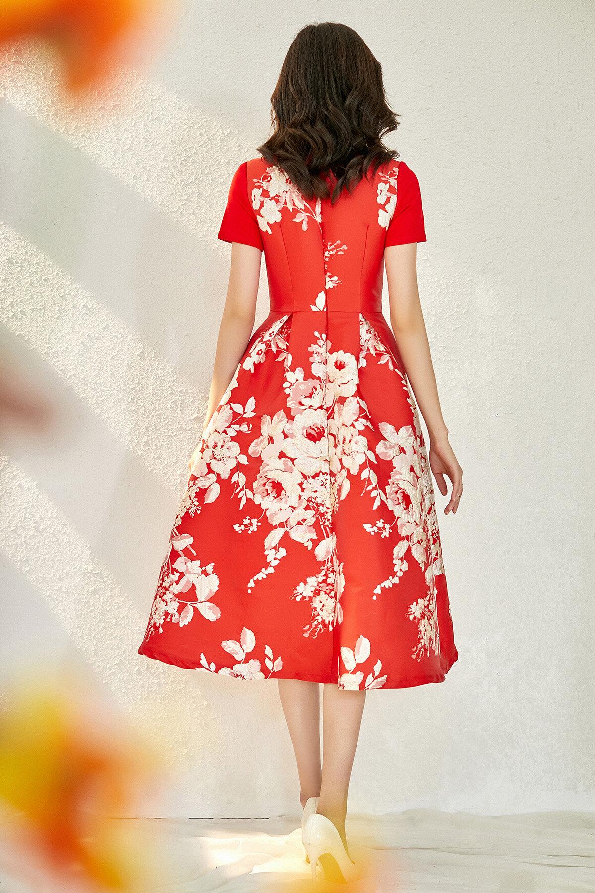 Spring retro 1950 red feminine jacquard short sleeve wedding guest audrey hepburn dress - Bailey