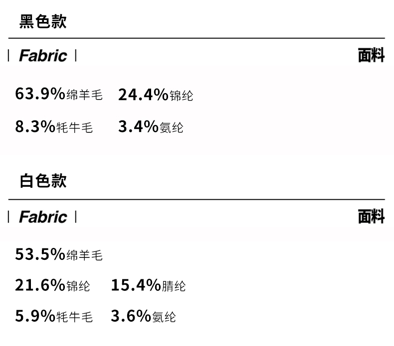 Material composition: 63.9% sheep wool, 24.4% polyamide fiber (nylon), 8.3% yak hair, 3.4% polyurethane elastic fiber (spandex)