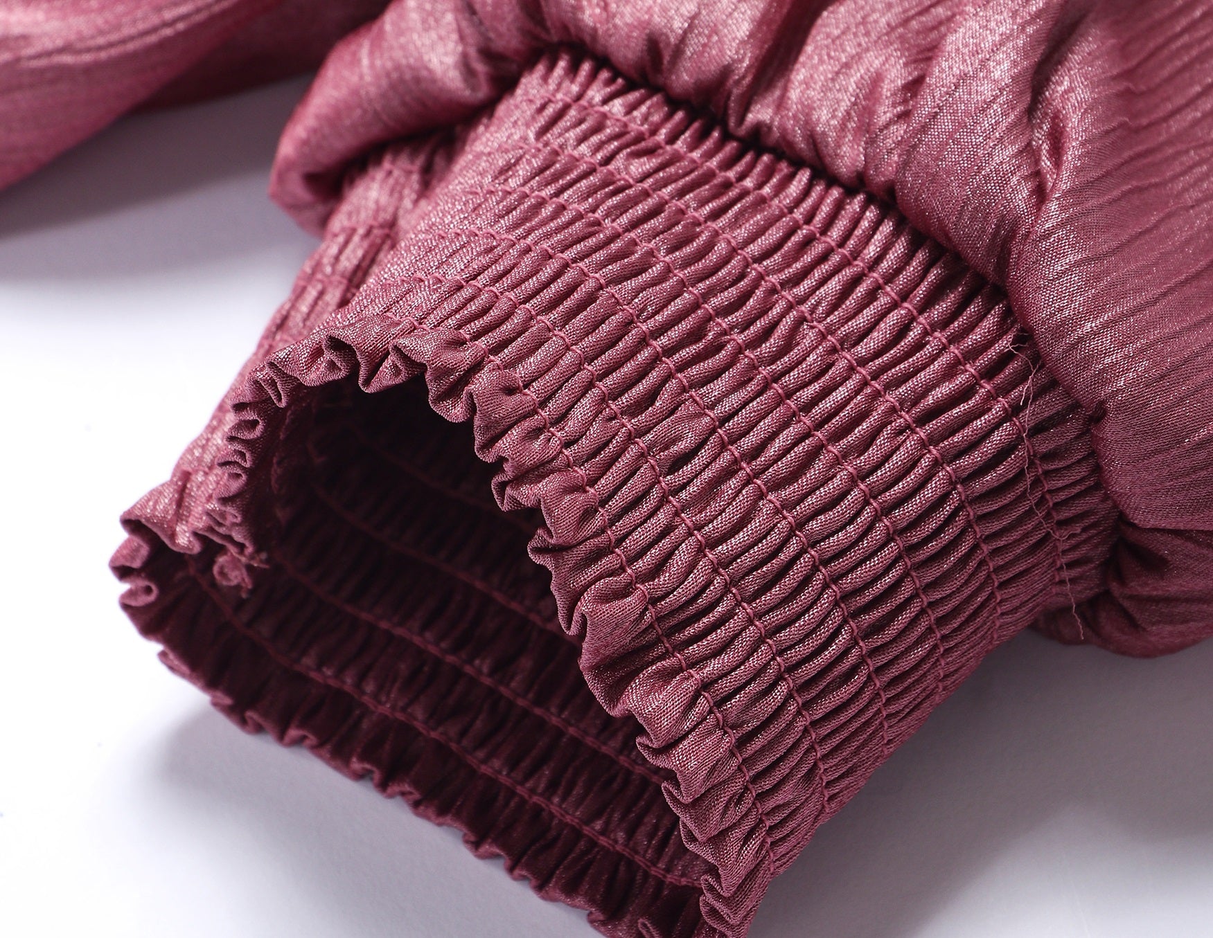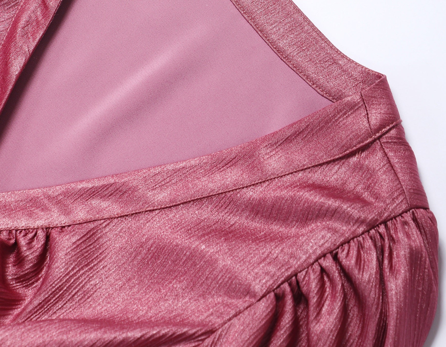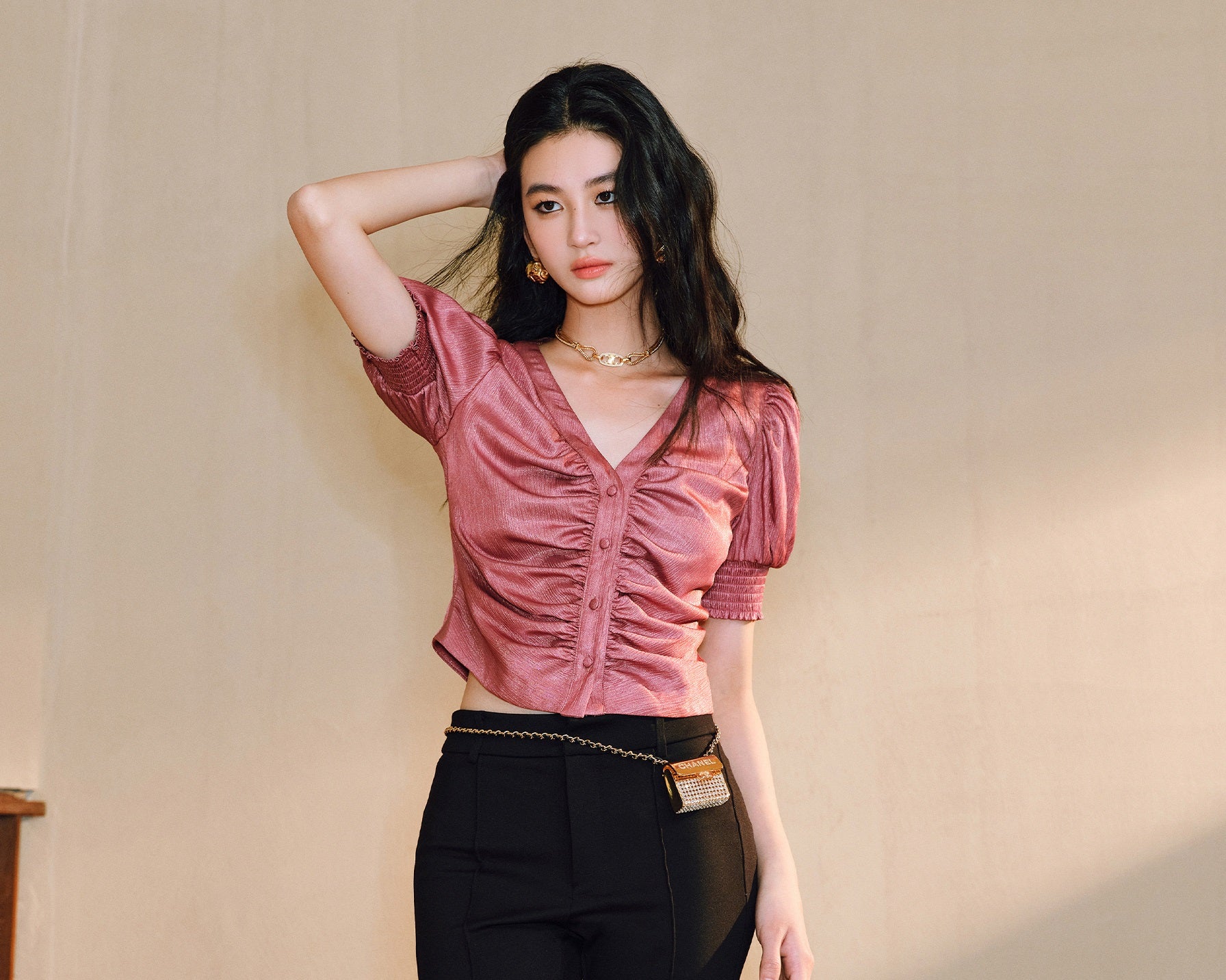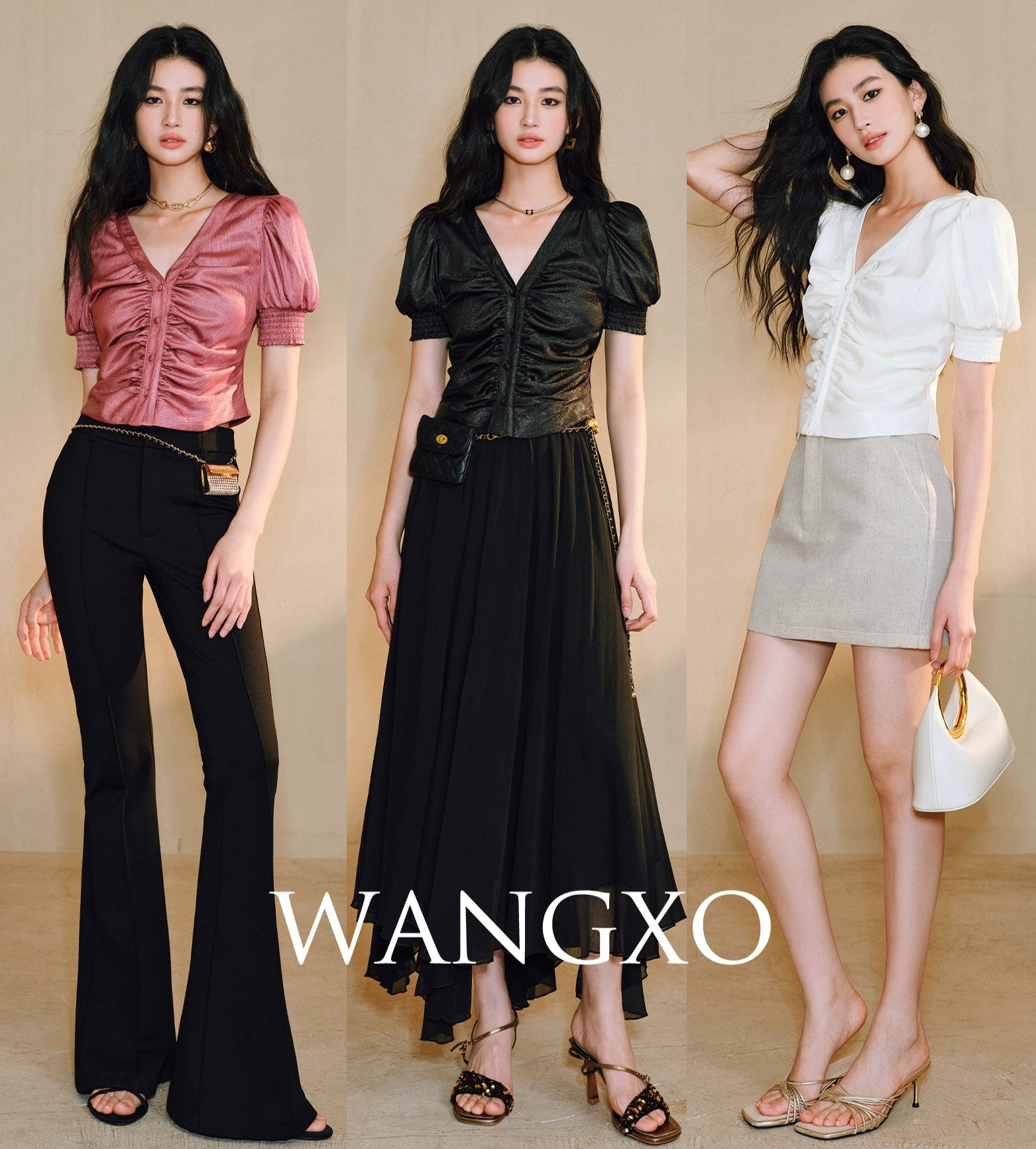 The WANGXO Lumina Top in pink, black, and white offers a refined yet versatile option for both everyday wear and special occasions. Crafted from silk satin twill with a stretchy finish, it ensures comfort while maintaining a polished look. The short sleeves feature hand-pleated puff detailing that enhances its chic V-neck silhouette. This beautiful top combines elegance with practicality, making it a sophisticated addition to any wardrobe.