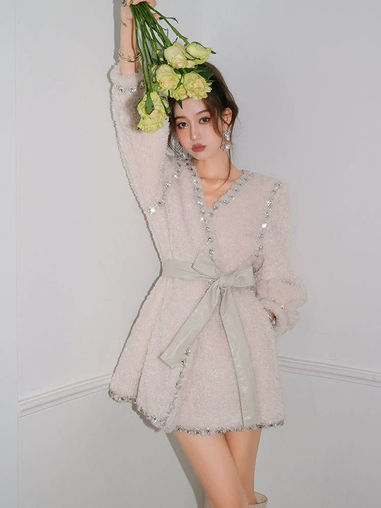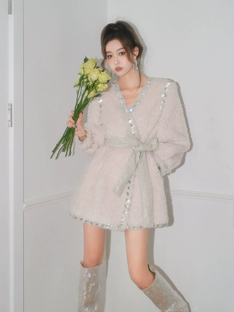 Wardrobes by Chen Luxury Beige V-Neck Long Sleeve Diamond Stud Coat-Joy