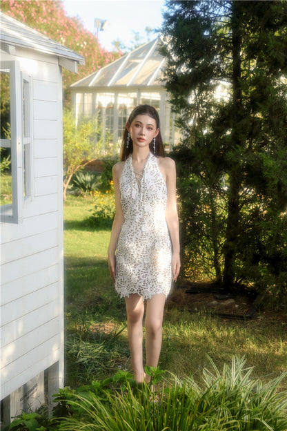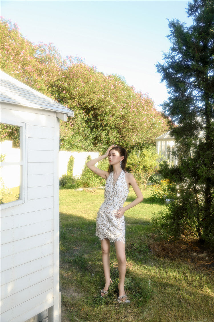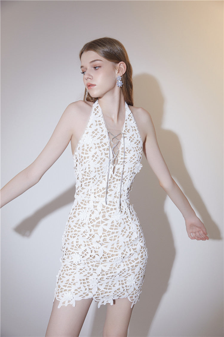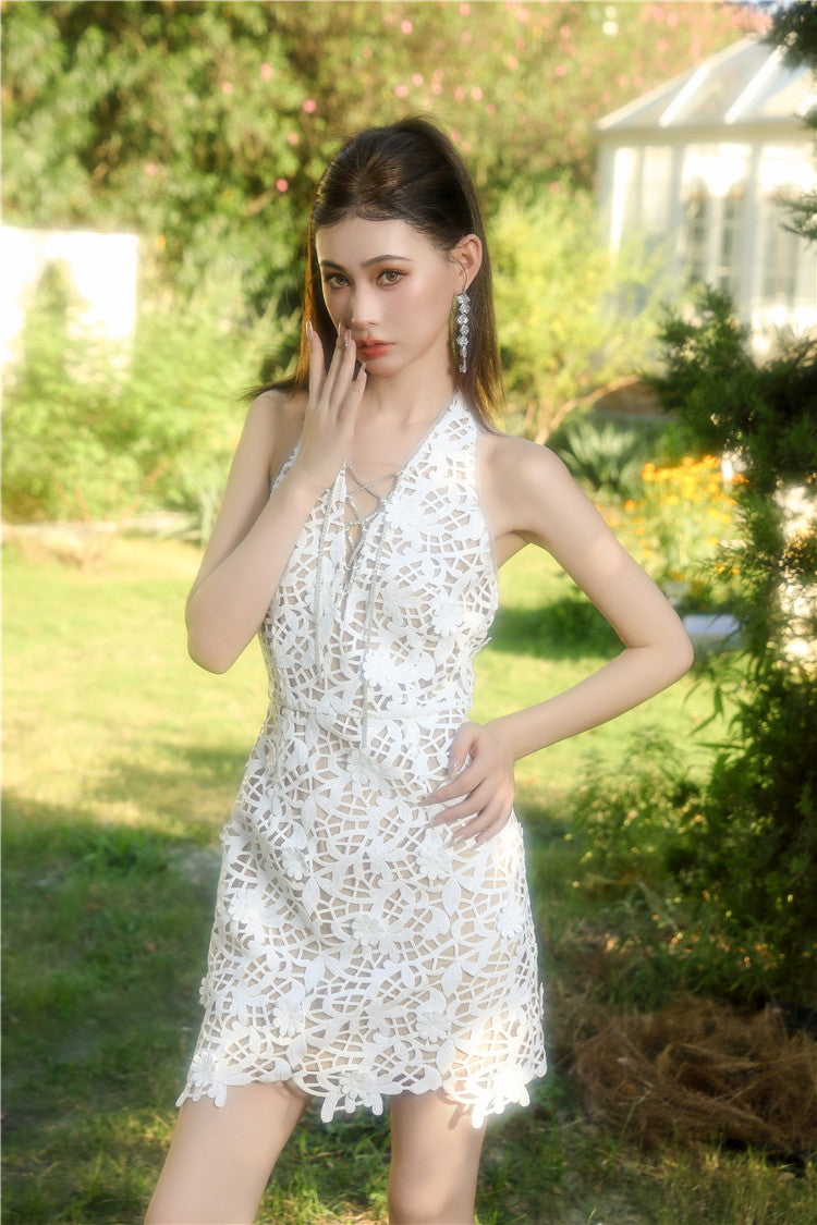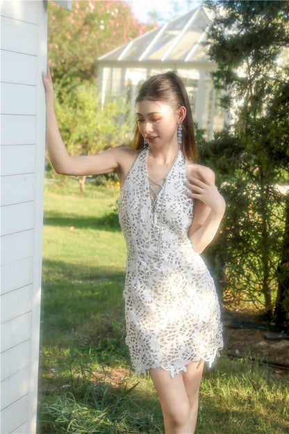 Wardrobes by Chen White bridal lace Halter Neck short Dress-LALA