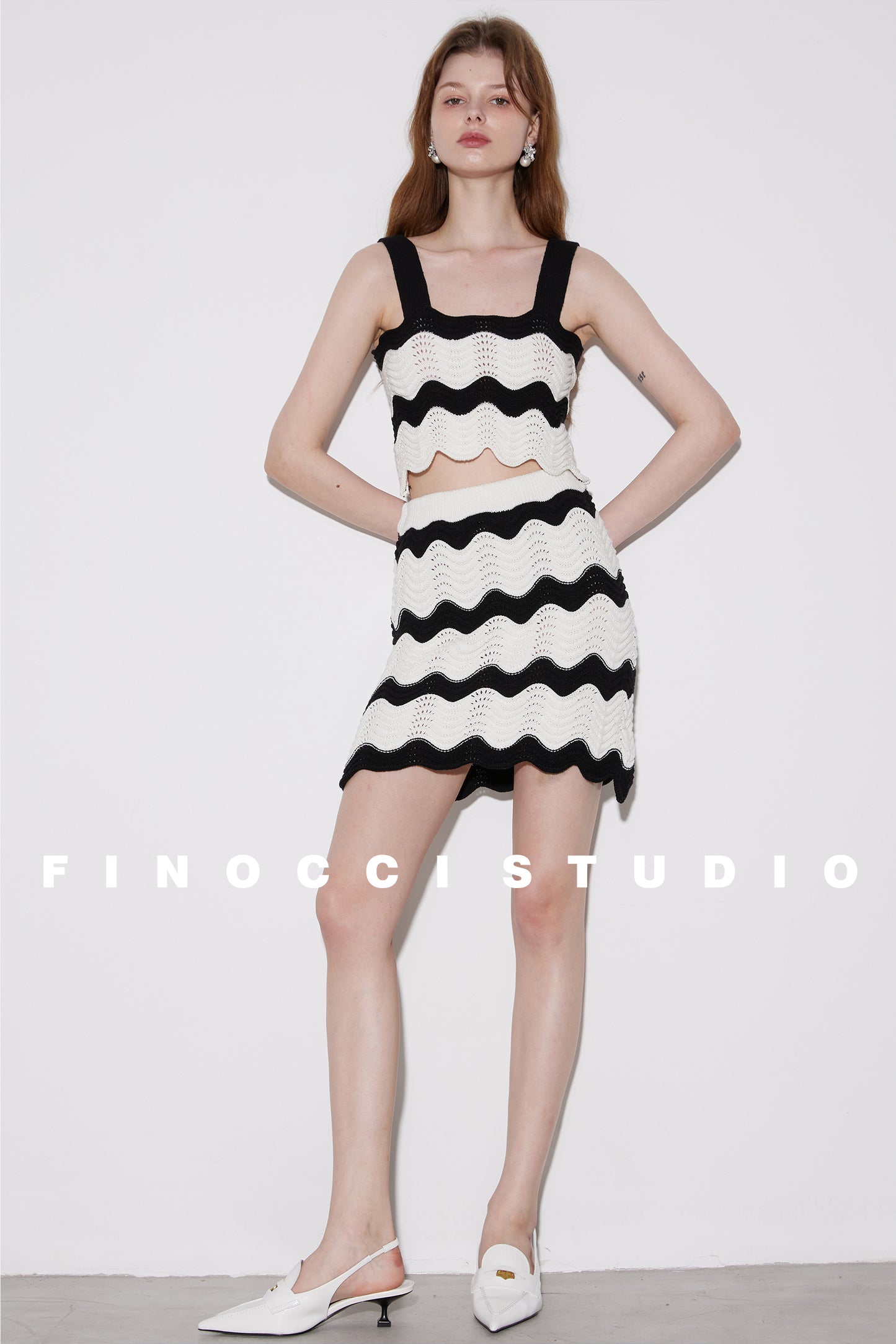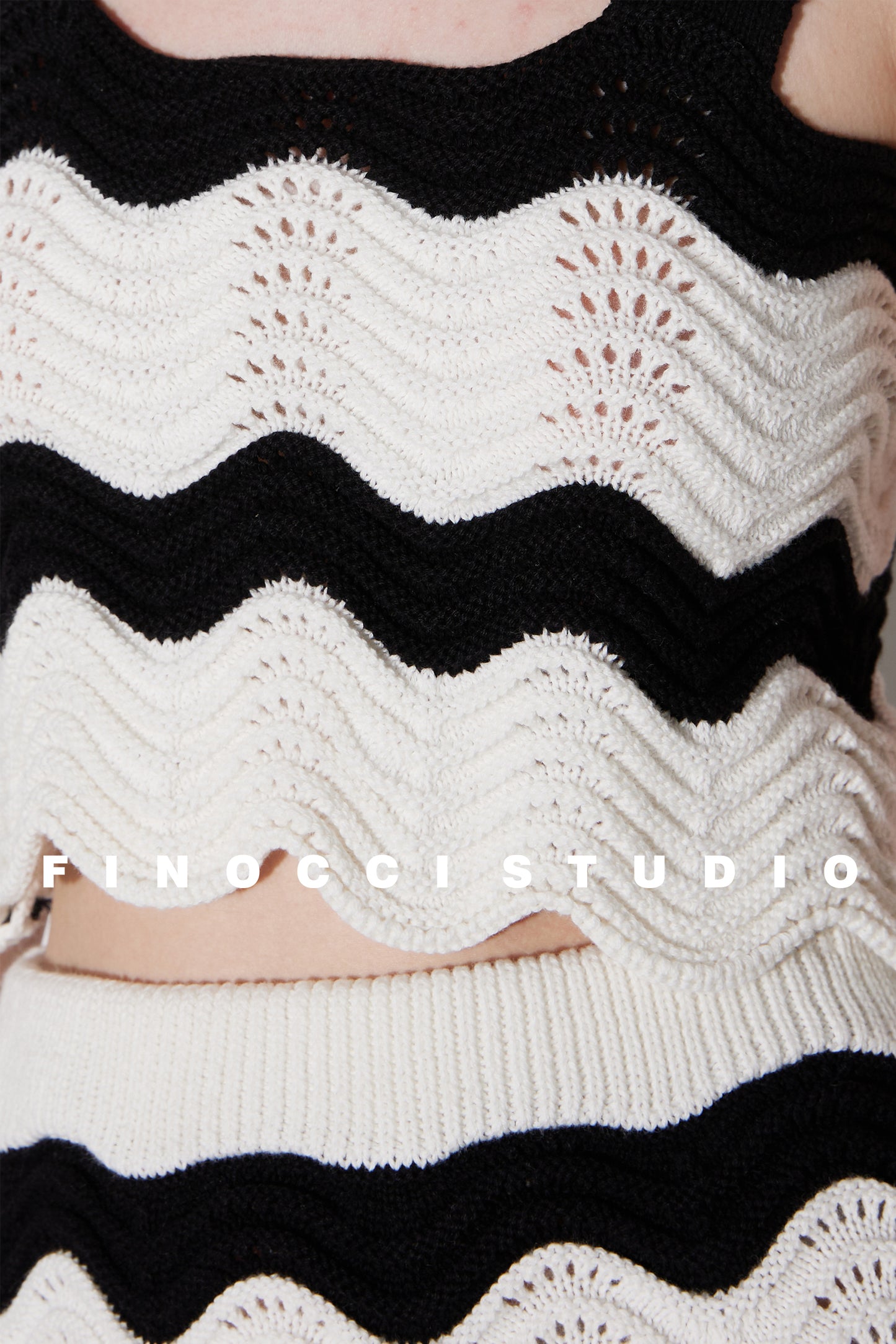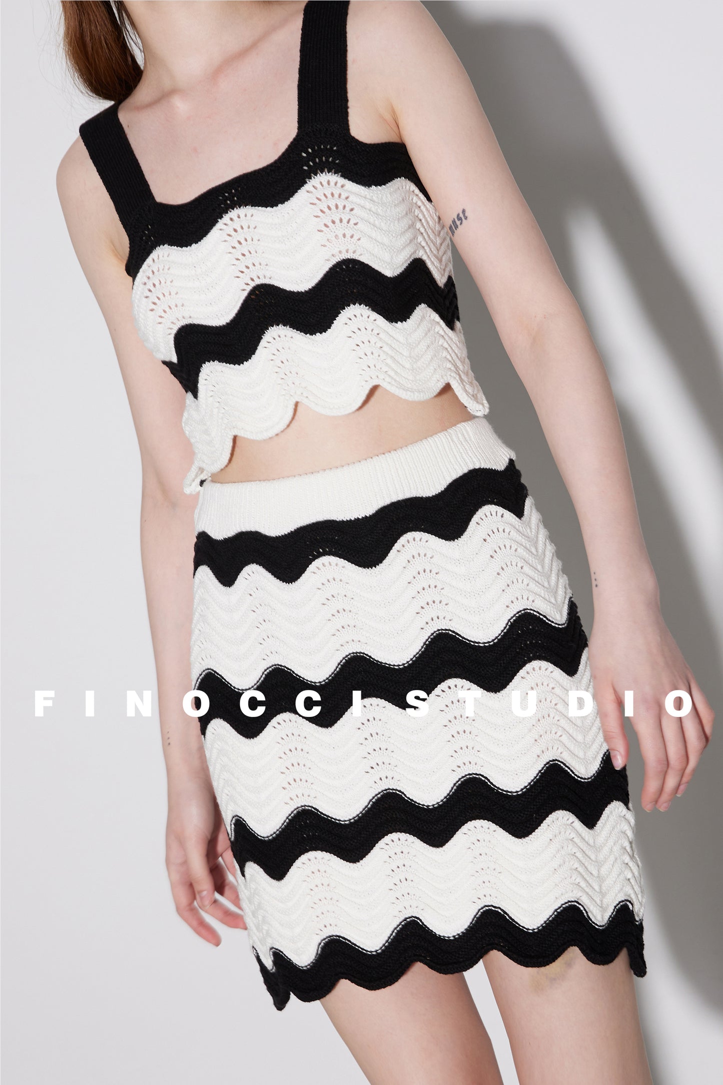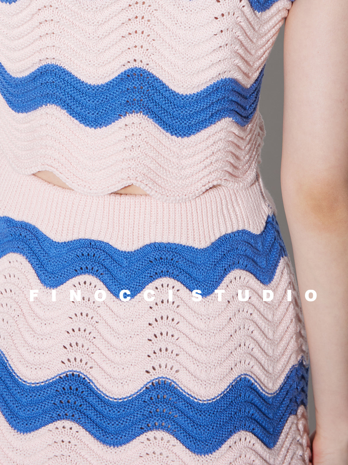 Waves colorblock holiday vacation Knitted Cotton top Vest+ Skirt Set - Biare