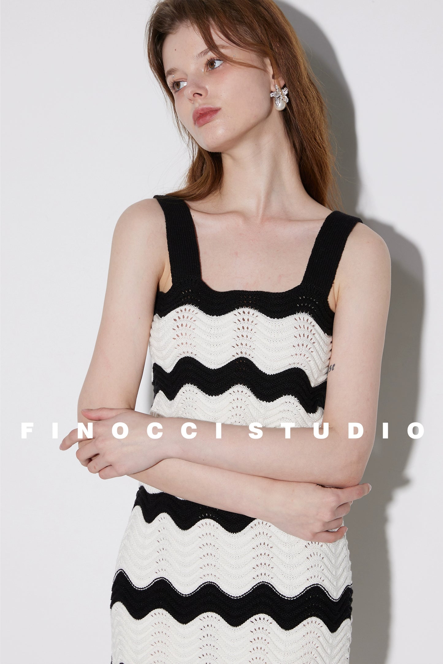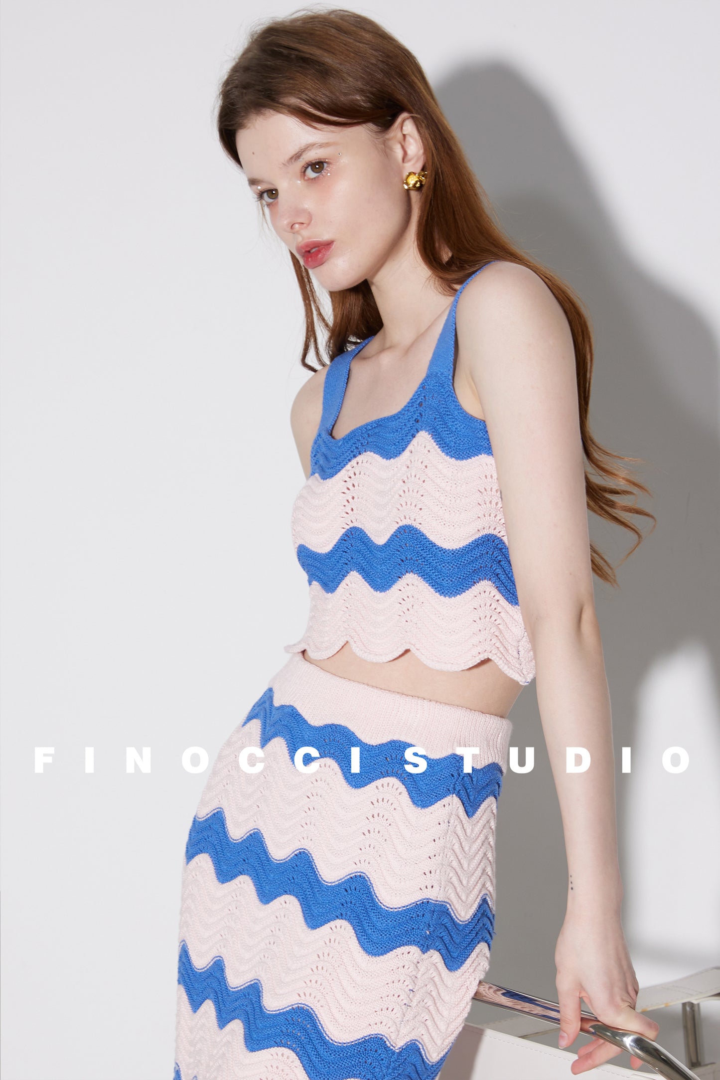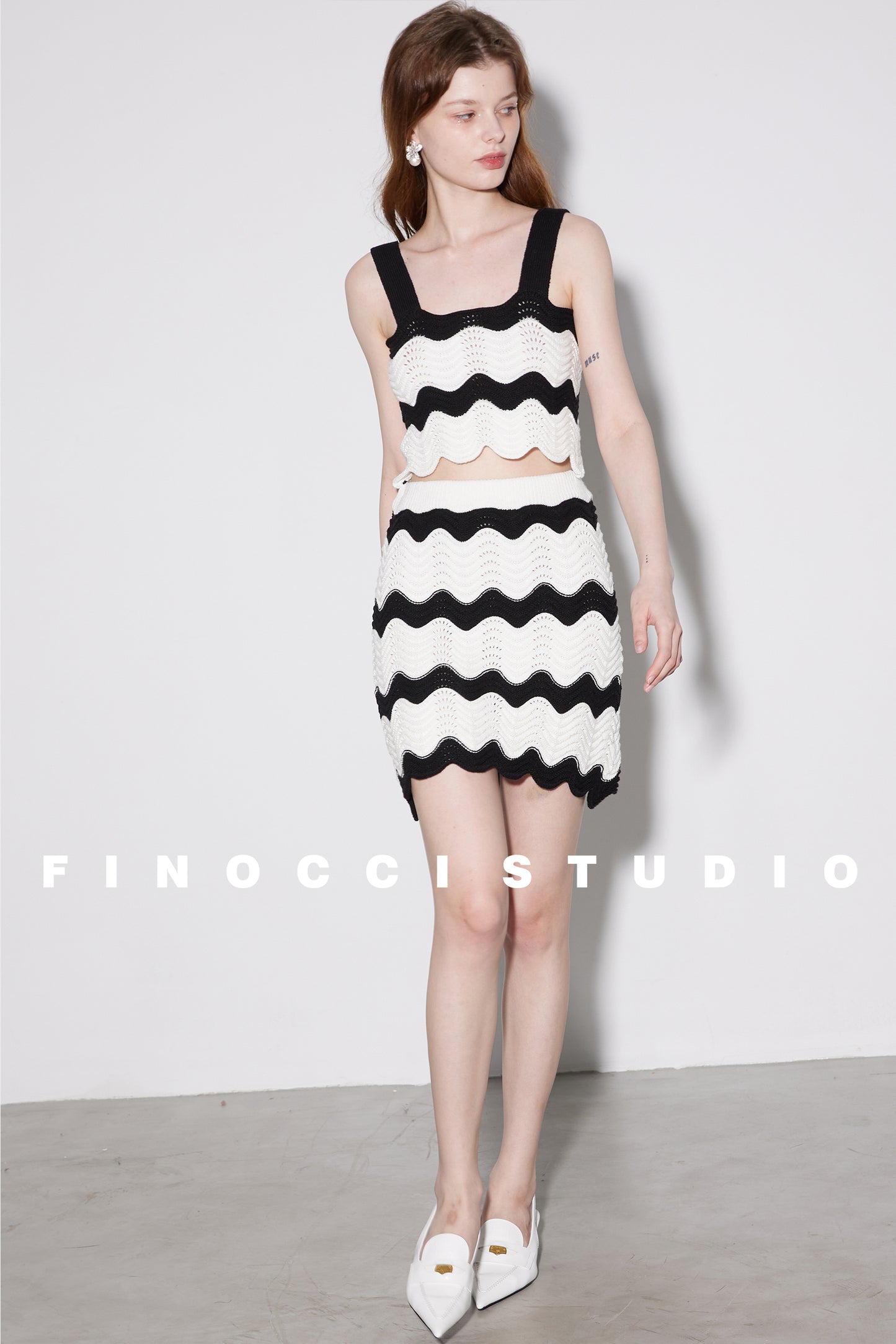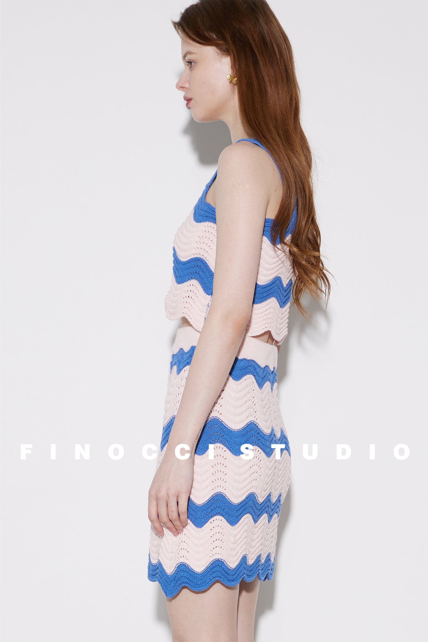 Waves colorblock holiday vacation Knitted Cotton top Vest+ Skirt Set - Biare