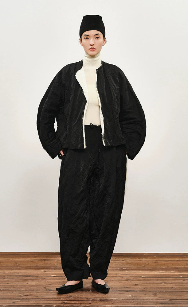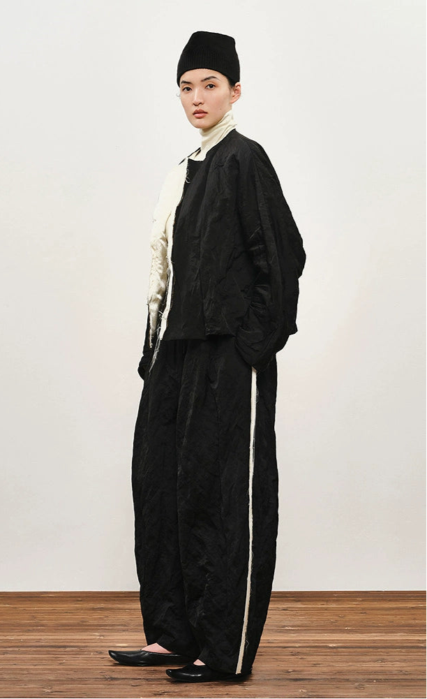 These  cocoon pants combine a relaxed silhouette with refined details, featuring a pleated black texture and contrasting woven stripes that add subtle dimension. Crafted for comfort and style, their loose fit allows ease of movement while maintaining a contemporary, sophisticated look ideal for both casual and polished outfits.