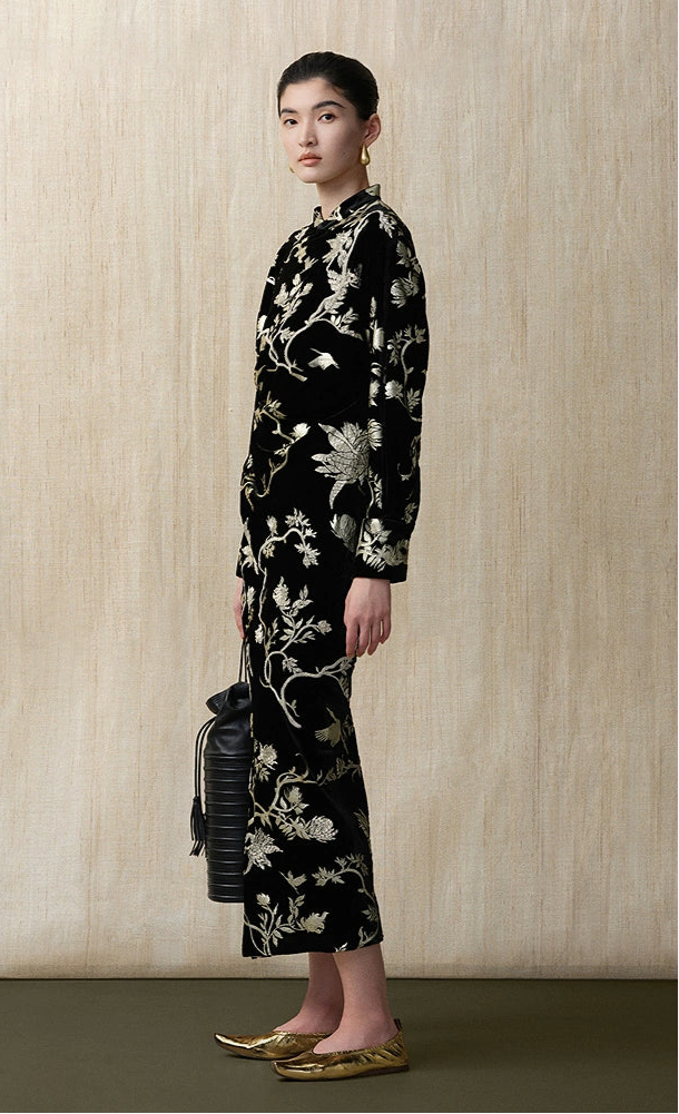 ZHUCHONGYUN bronzing velvet slit long sleeve floral dress-SHOUYA.