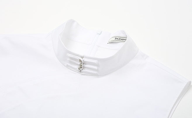 This sleeveless summer shirt features a refined stand collar and a distinctive Chinese buckle closure for a minimalist yet sophisticated look. Crafted in crisp white, it offers breathability and comfort ideal for warm weather. The tailored fit enhances a polished silhouette, making it perfect for both casual and semi-formal occasions.