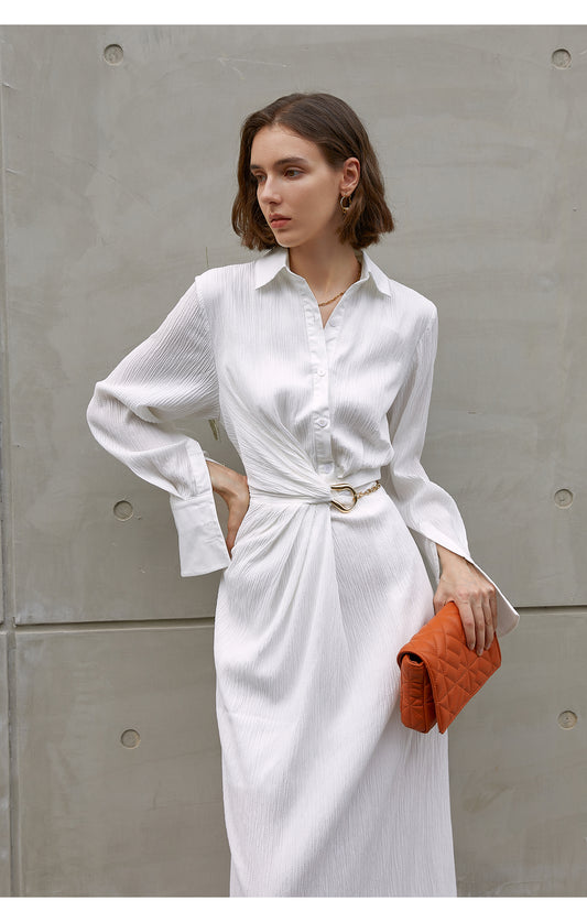 Asymmetrically-waisted summer dress white, polo-collared shirt, single-breasted dress-Cicili