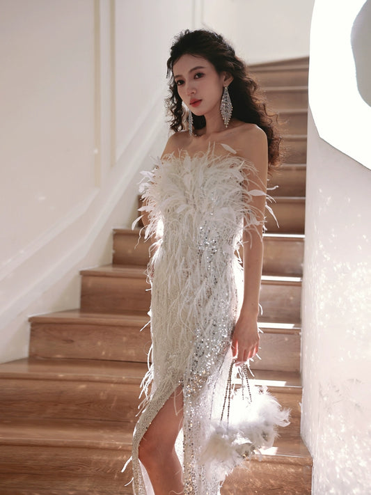 DOLLY White Feather Tube Top Sequin Slim Fit Long Dress-STEPH