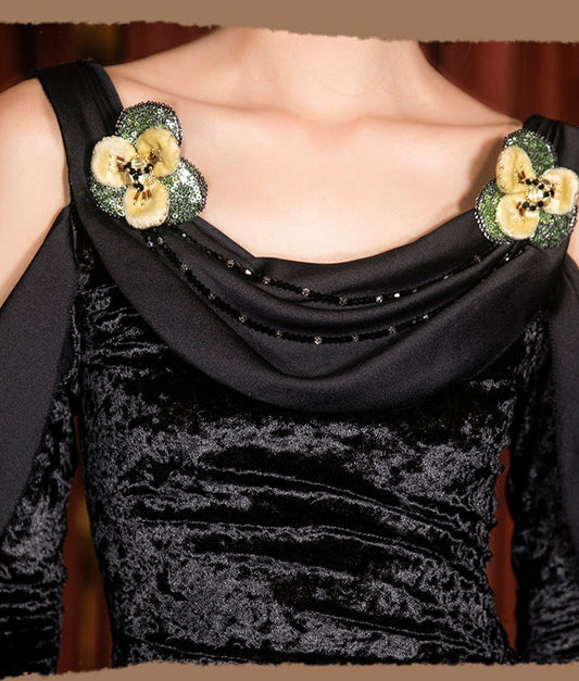 MagicQ black diamond velvet off-the-shoulder swing collar with silk side slit long-sleeved high-rise dress