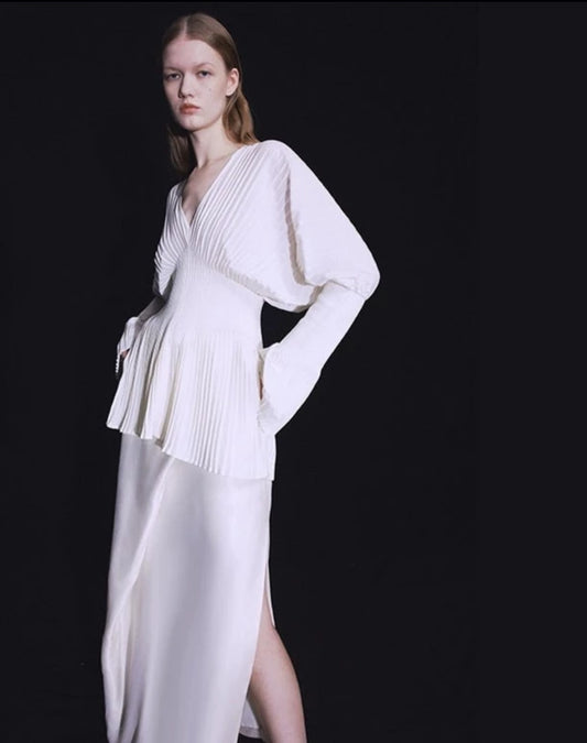 MAYALI V-NECK PANELED TUNIC WHITE TOP DESIGNER CINCHED WAIST CHIC PLEATED SHIRT JACKET SIMPLE WOMEN'S SUMMER