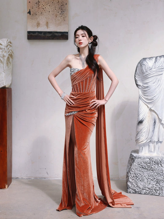 DOLLY Luxury Brown Velvet Greek Style Long Slit Banquet Dress-KARA