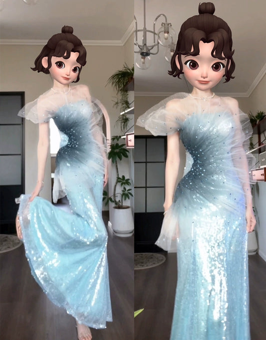 DOLLY Luxury Blue Deep V-Neck Sleeveless Long Fish Tail Sequin Cocktail Dress-AROURA