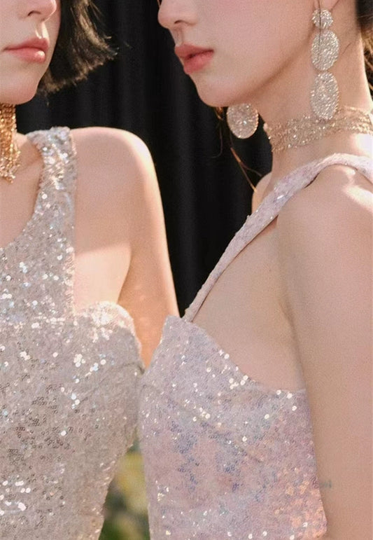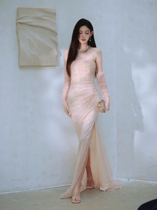 DOLLY Luxury Light Pink Sleeveless Sequin Bandeau Slim Fit Dinner Dress-Kosy