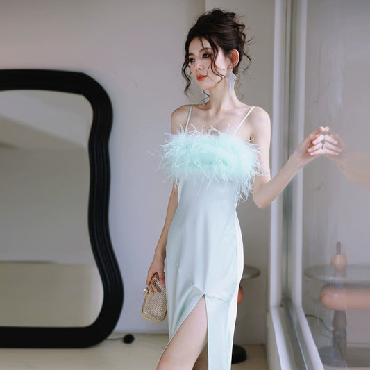 DOLLY Luxury Mint Fluffy Feather Slim Fit Satin Long Slit Suspender Dress-COLA