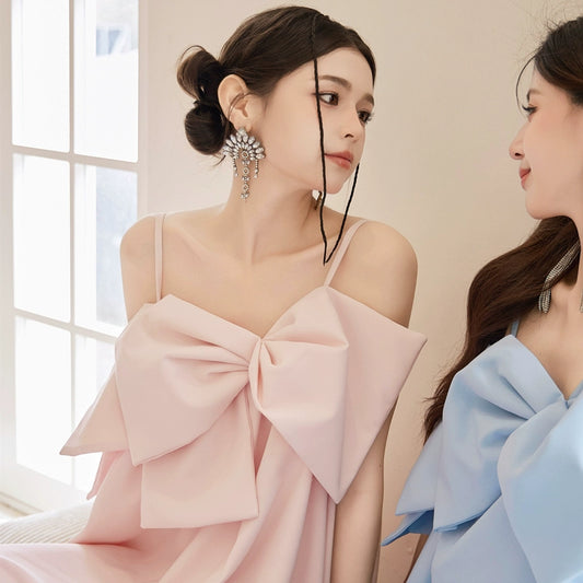 DOLLY Luxury Pink/Blue Sleeveless Big Bow Long Loose Resort Suspender Dress-JIJI