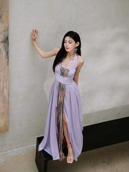 DOLLY Luxury Purple Halter Neck Backless Tassel Sexy Long Party Dress-Babe
