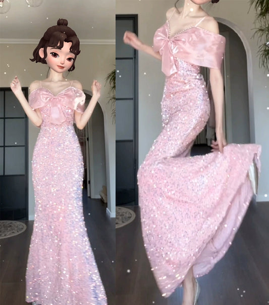 DOLLY Luxury Pink Off Shoulder Big Bow Body Shape Long Formal Dinner Dress-KATHY