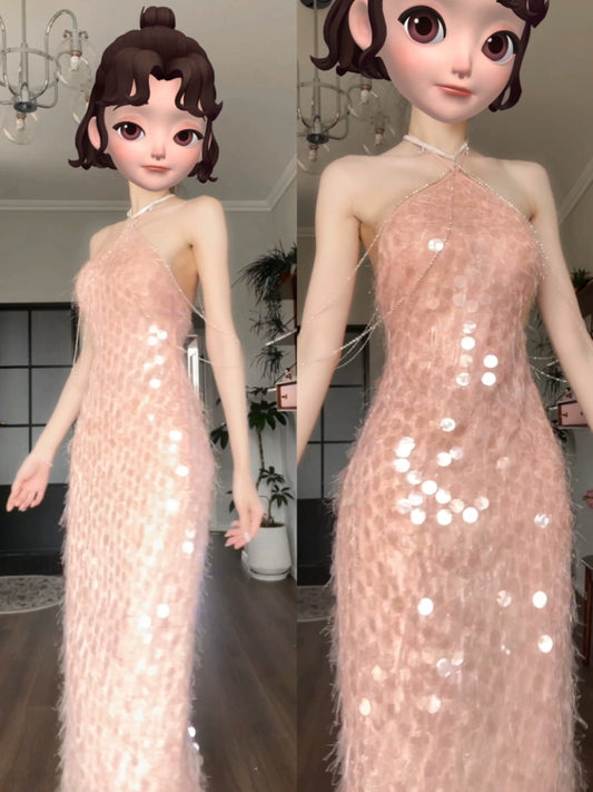 DOLLY Luxury Pink Halter Collar Sleeveless Slim Fit Sexy Halter Dinner Dress-MELODY