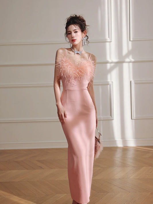 DOLLY Luxury Peach Pink Feather Tube Top Long Dinner Date Dress-VERO
