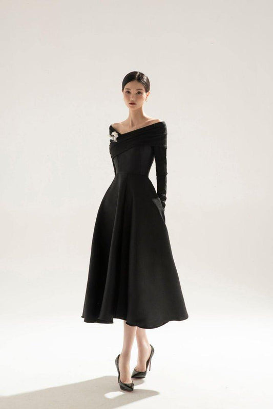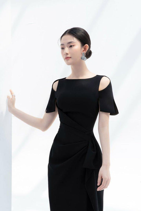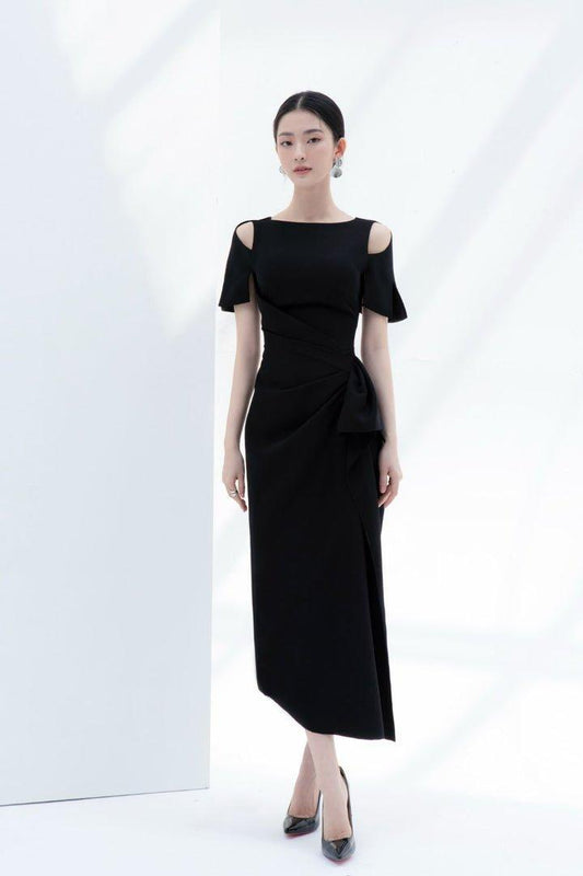 Black open shoulder midi dress-BLAIR
