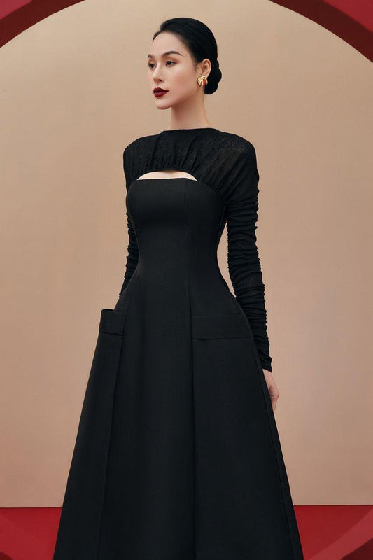 Black gathered long sleeves dress-ASH