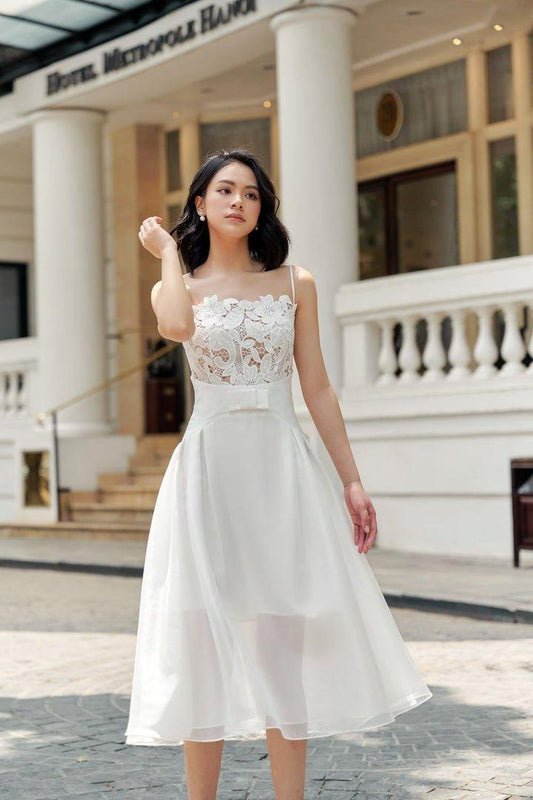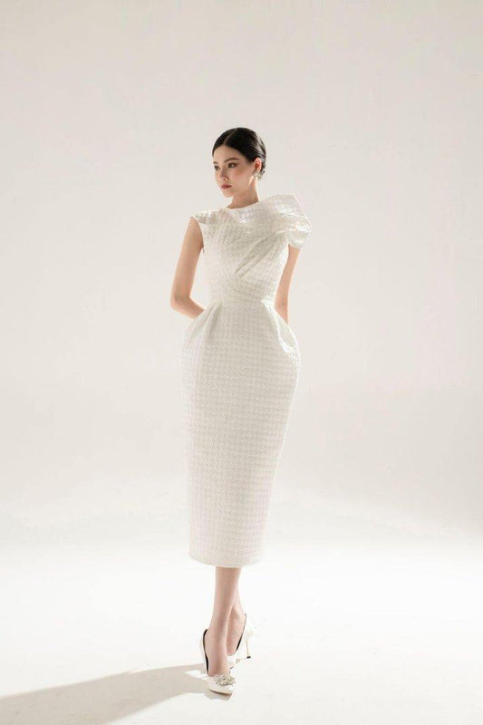 White brocade midi asymetric dress-FAE