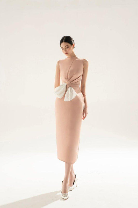 Nude Pink taffeta 3d texture bow dress-ELLE