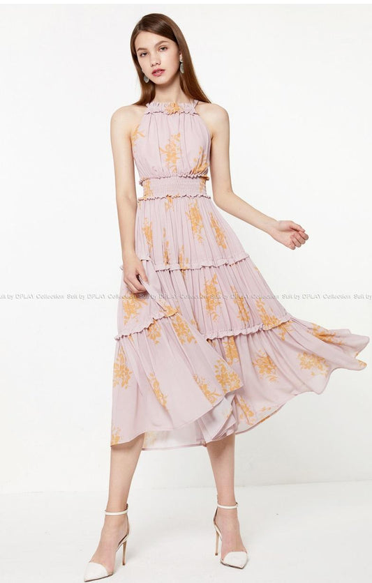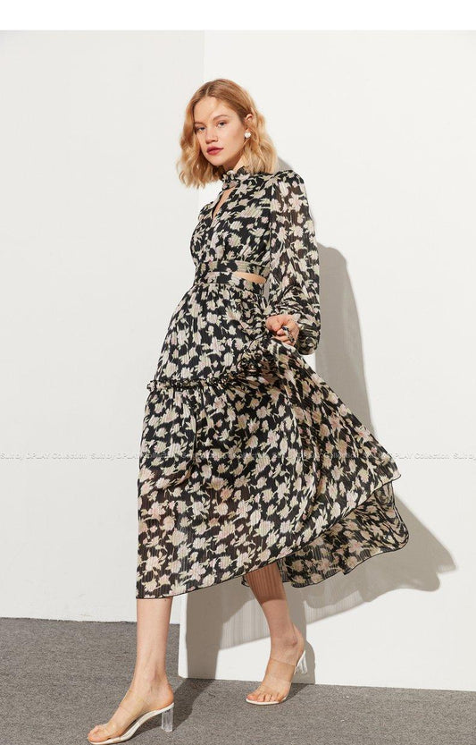Retro pastoral print cutout design chiffon long-sleeved print dress- Rita