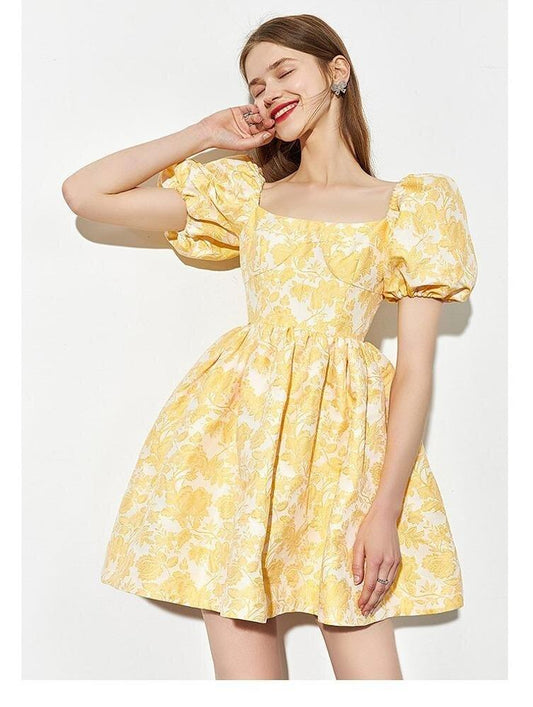 summer New Sweet Fairy Retro Palace Collar Puff Sleeve Jacquard Dress- Nium