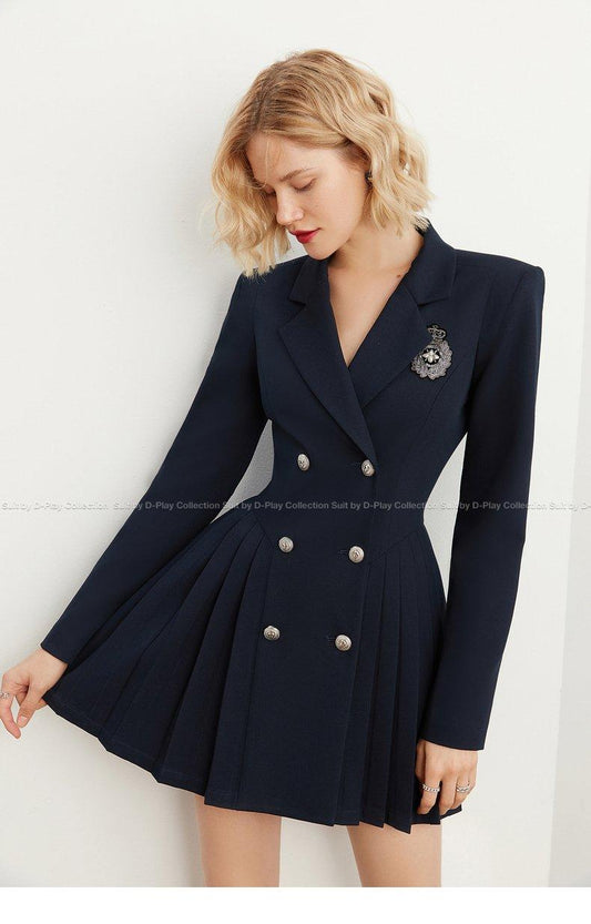 DPLAY Spring Retro Navy Blue Pleated Wide Shoulder Suit Skirt - Celabi