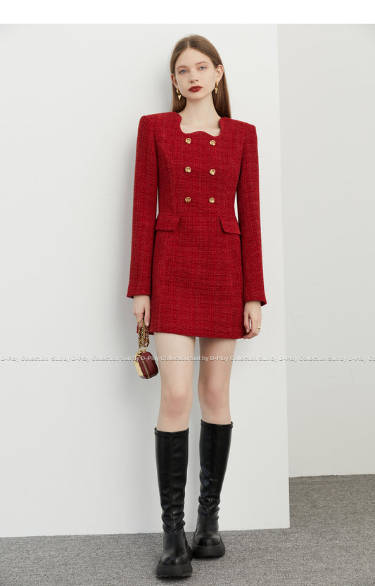autumn winter retro jam red irregular lace metal buckle tweed dress