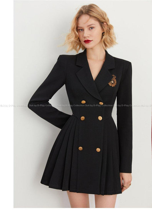 DPLAY Spring Retro Black Pleated Wide Shoulder Suit Skirt - Fioma