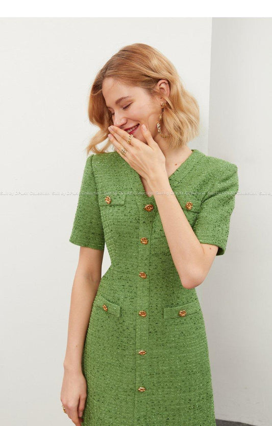 Green V-Neck short sleeve Tweed cocktail dress- Sara