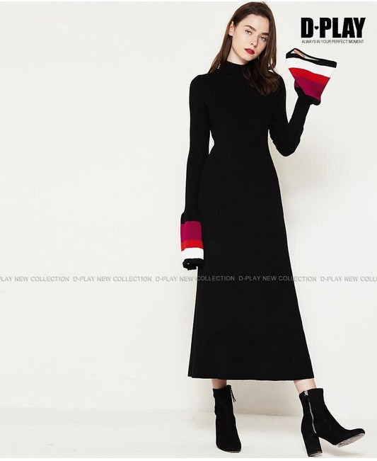 Fall winter Black Halter Contrast Color Flare Sleeve Slim Long Knit sweater Dress - kania