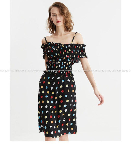 Retro off collar strapless black polka dot elastic waist dress Slit-neck sling with elastic dress - Chel