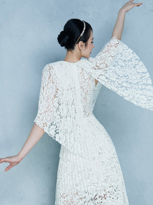 Retro vintage lace cape shawl collar pleated midi lace dress - Tiuna