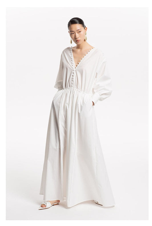 LEDIM W French V-Neck Breasted Waist Slim Summer white dress- Kaio