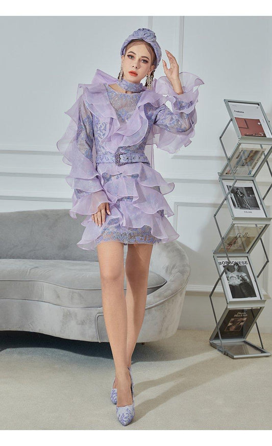Ruffled multi-layer scarf dress midi long sleeve dress- Sofia